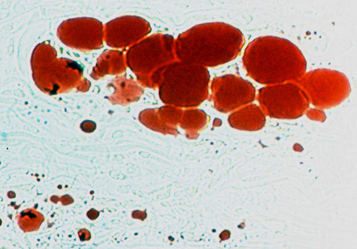 Eine Gegenfärbung mit Oil-Red, einem typischen Farbstoff für Fett, ergab die