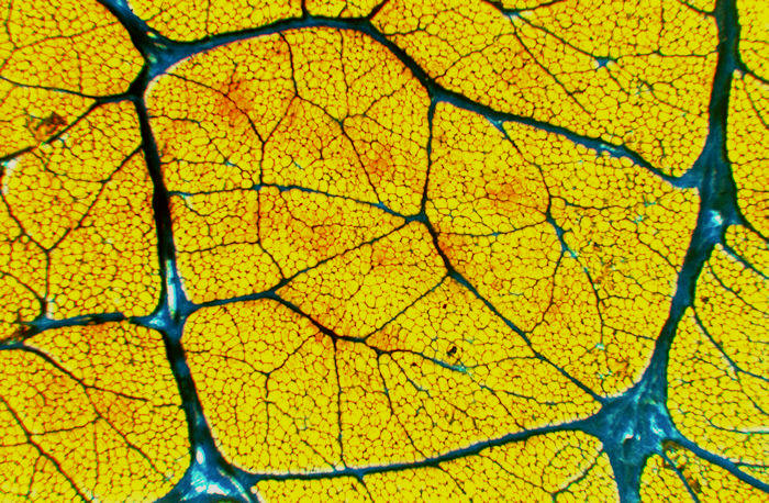 Fasern sehr gut erkennen. In der Mitte sind einzelne Fettzellen zu sehen.