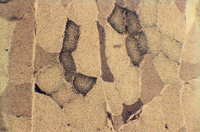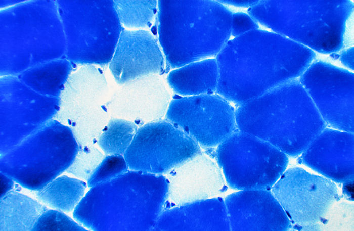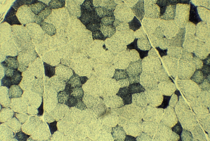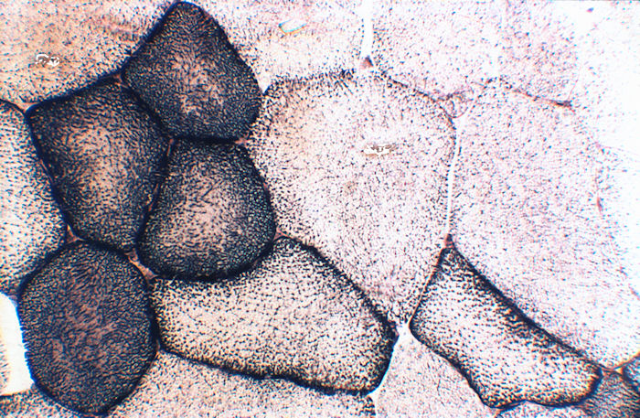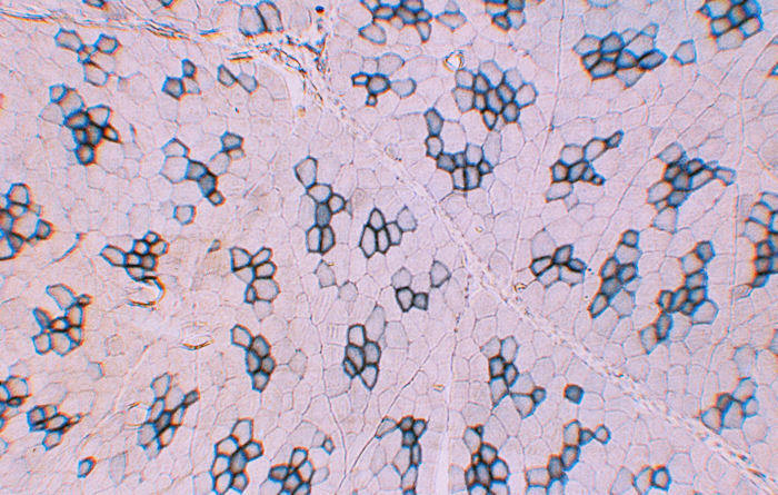 Im Querschnitt des Muskelgewebes findet man verschiedene Muskelfasertypen.