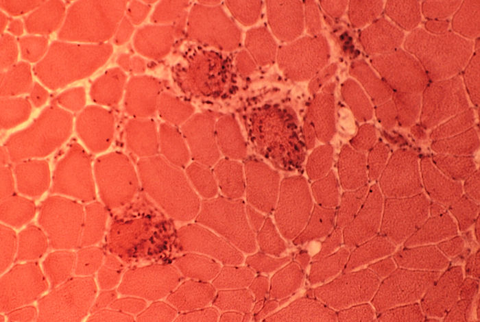 Absterbende (nekrotische) Muskelfasern sind recht gut daran zu erkennen,